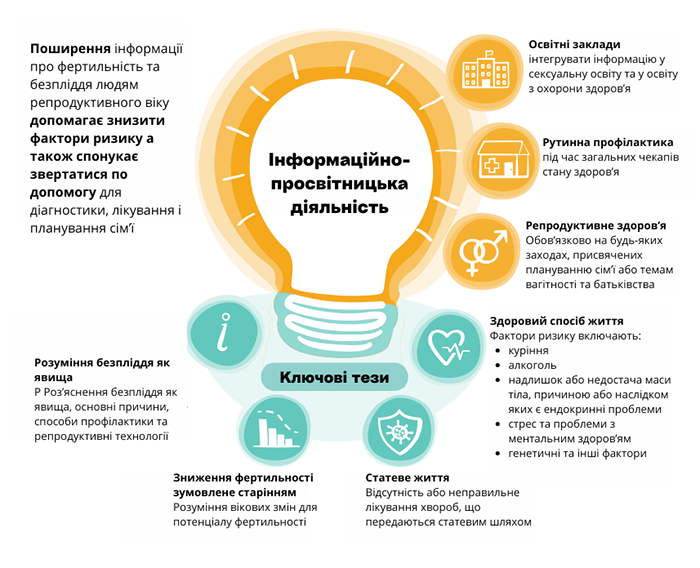 Як наголошує WHO, комплексне рішення проблеми безпліддя має починатися з правильної взаємодії із пацієнтами, а саме з освітньо-інформаційних кампаній. Репродуктивне здоров’я є темою і питанням, яке слід обговорювати з пацієнтами з першого ж їх візиту в клініку. Окрім того, корисна взагалі будь-яка просвітницька діяльність, тому що це підвищує шанси запобігти потенційним проблемам у людей різного репродуктивного віку.