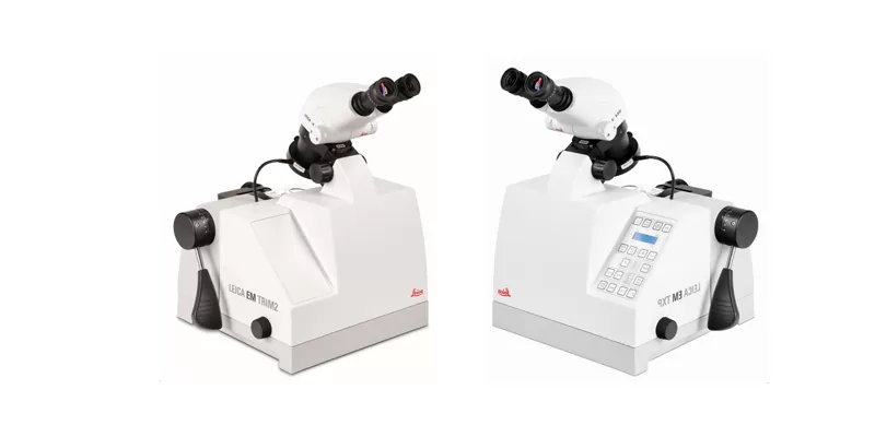 Серія EM від компанії Leica включає спеціалізовані системи для прецизійної пробопідготовки механічних зразків і створення «пірамідки» з біологічних зразків, залитих в епоксидну смолу.