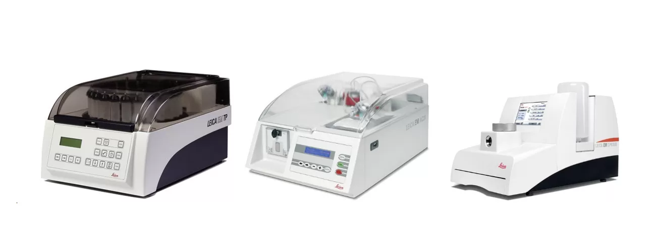Устройства для пробоподготовки биологических образцов EM TP, EM AC20 и EM CPD300 от компании Leica Microsystems.